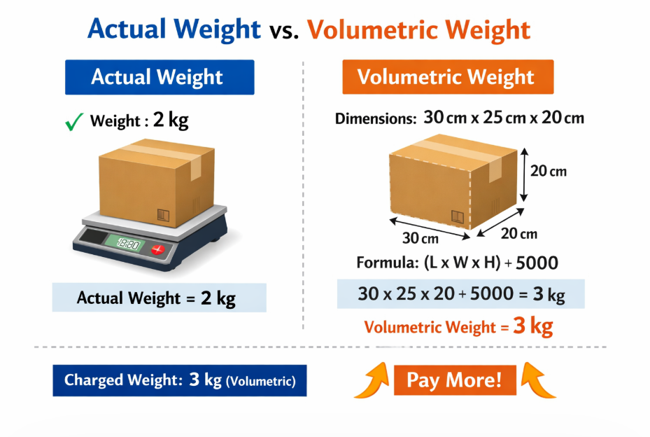 Here’s something most people don’t know until it’s too late: international couriers charge based on whichever is higher: your package’s actual weight or its volumetric (dimensional) weight.